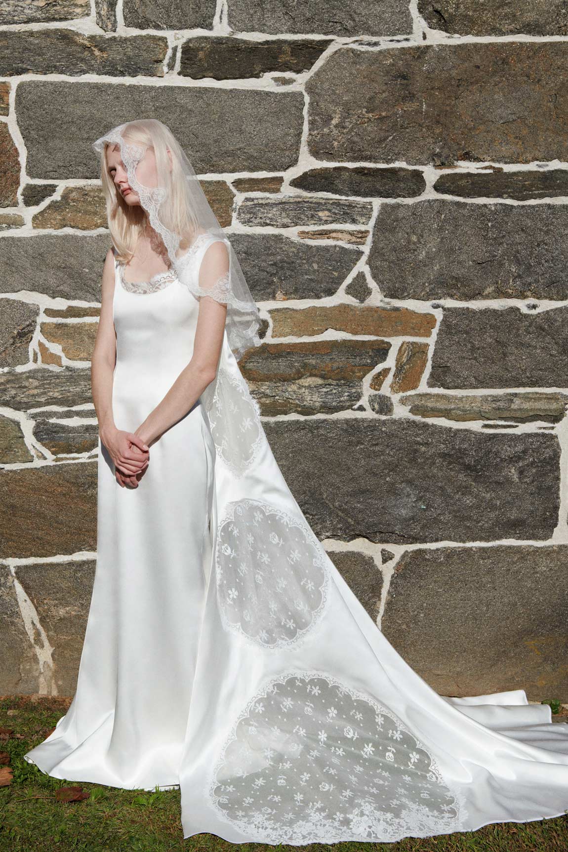 duchess satin gown with Chantilly lace inset detachable train
