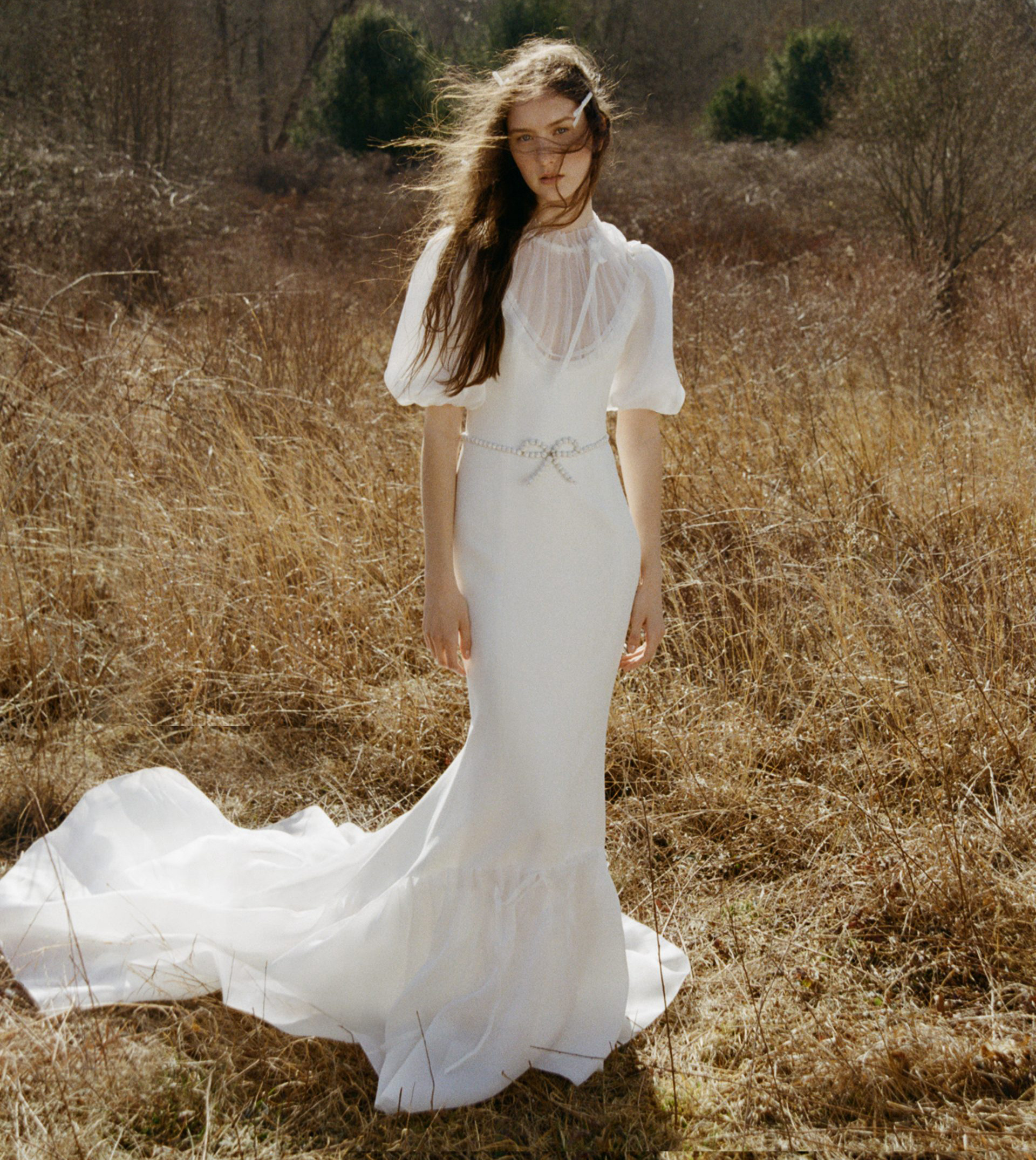 crepe gown with silk organza draped neck detail and hem with white velvet ribbon