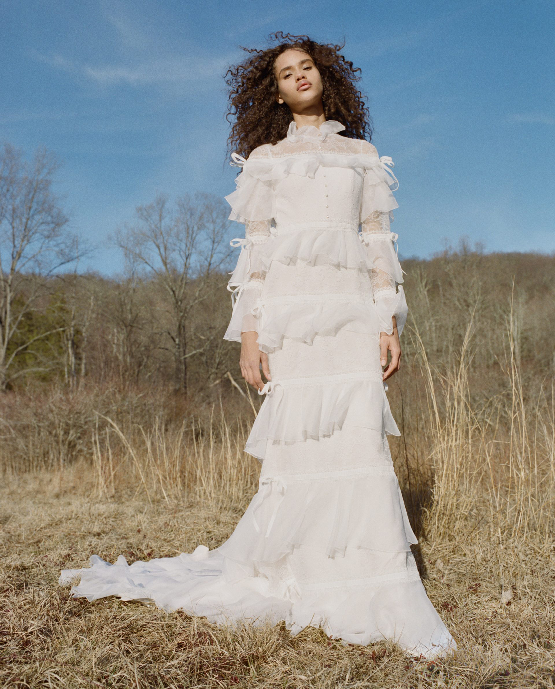 chantilly lace tiered gown with chiffon ruffles and floral lace trim with bows
