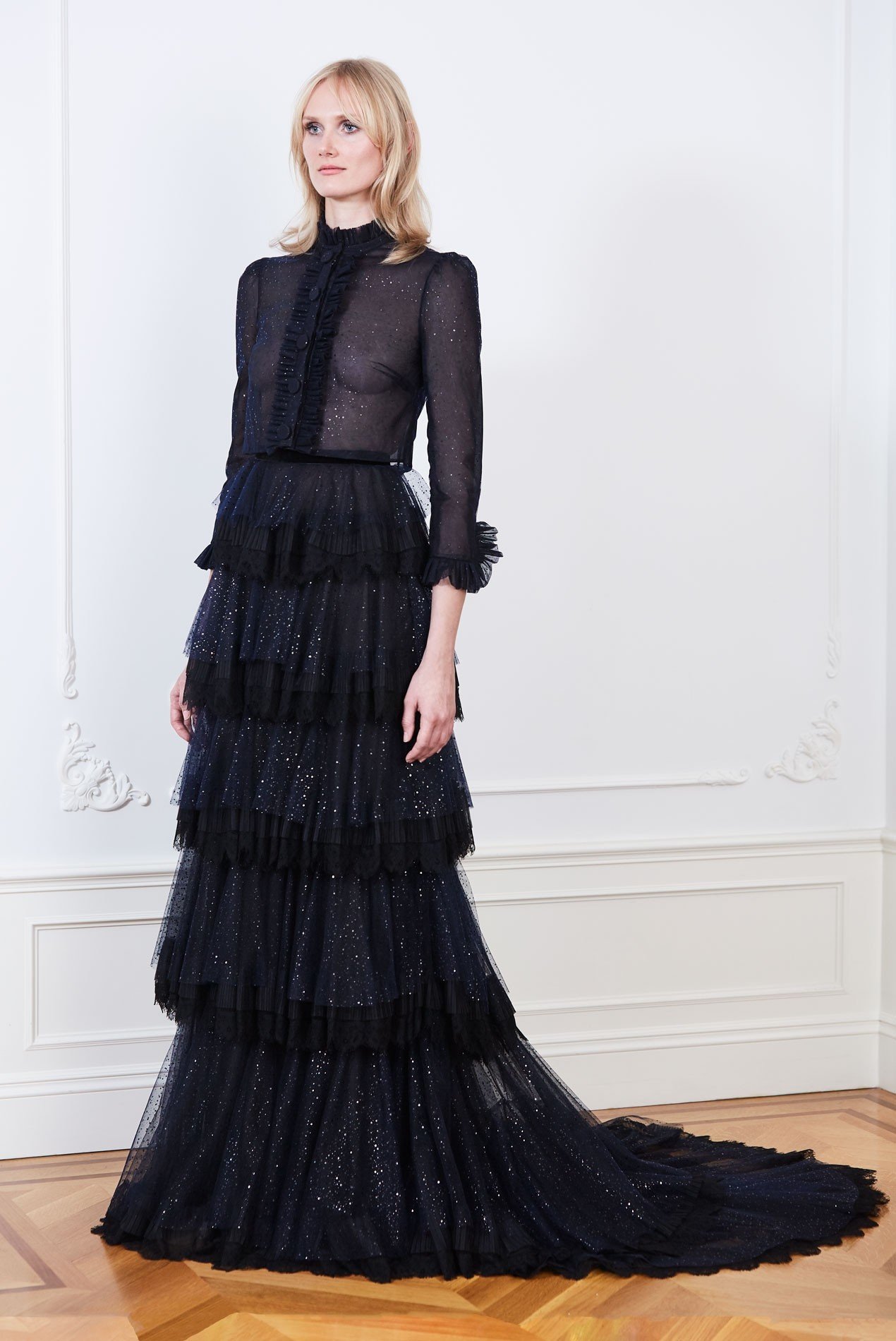 metallic dot tulle jacket and tiered skirt with chantilly lace