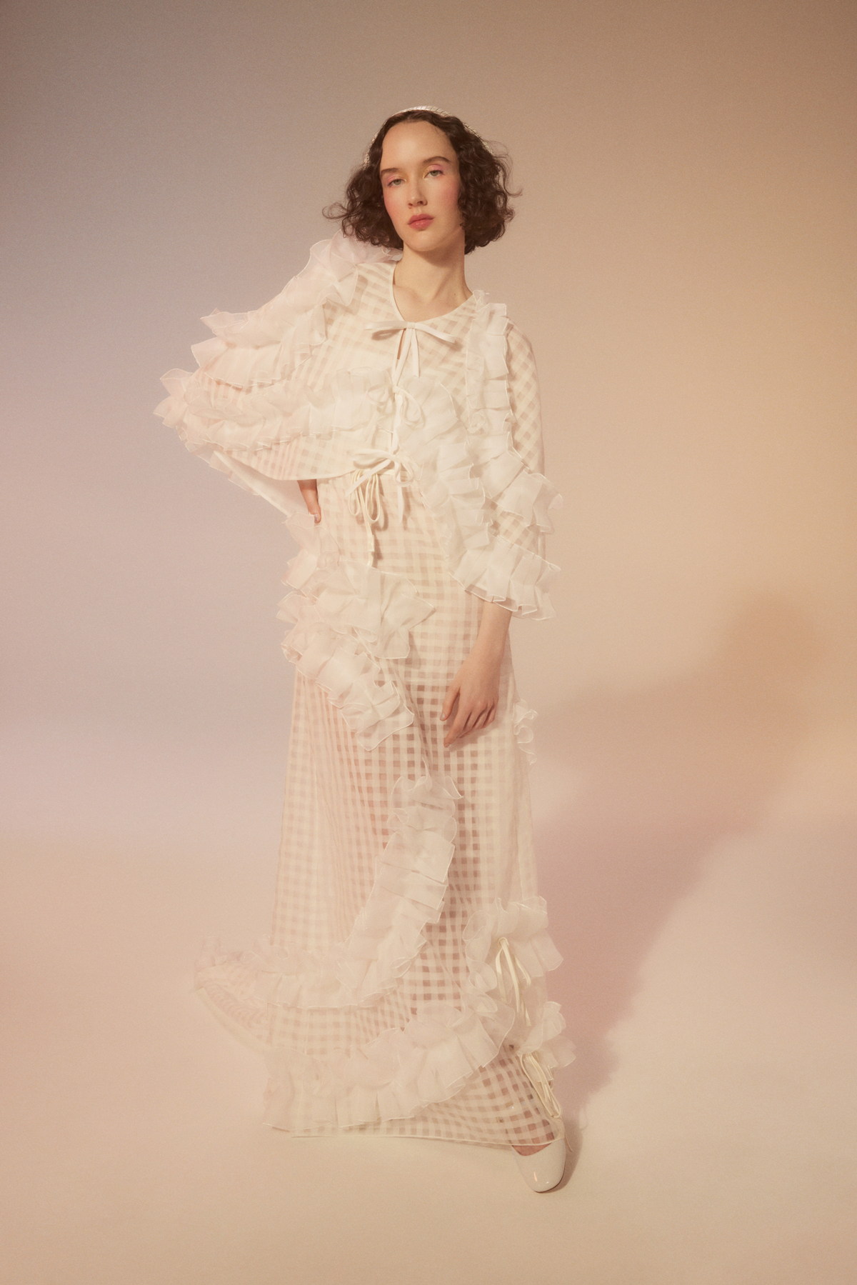 gingham silk organza bib gown and cape with ruffles