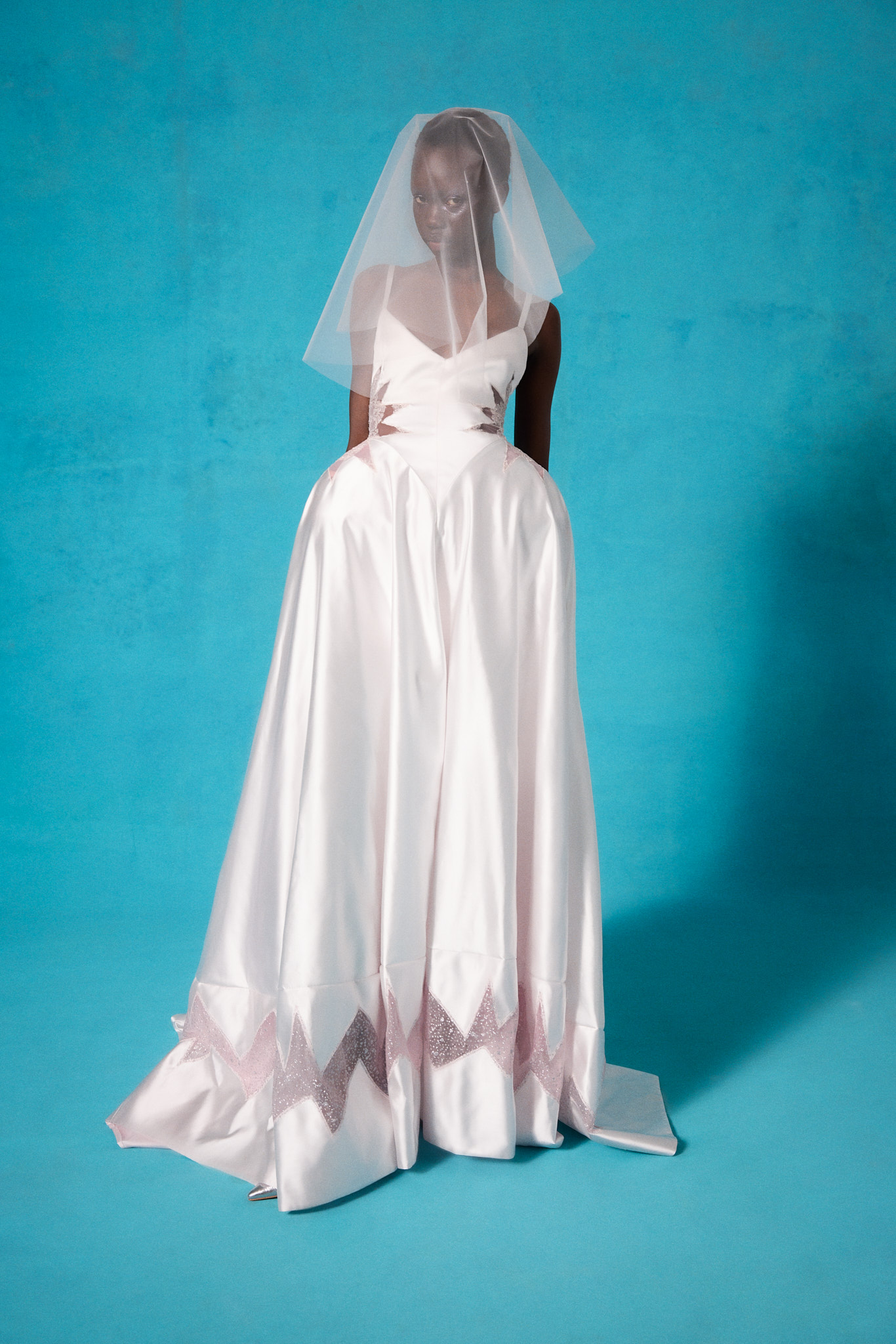duchess satin celestial gown with side lace insets and glitter tulle embroidery