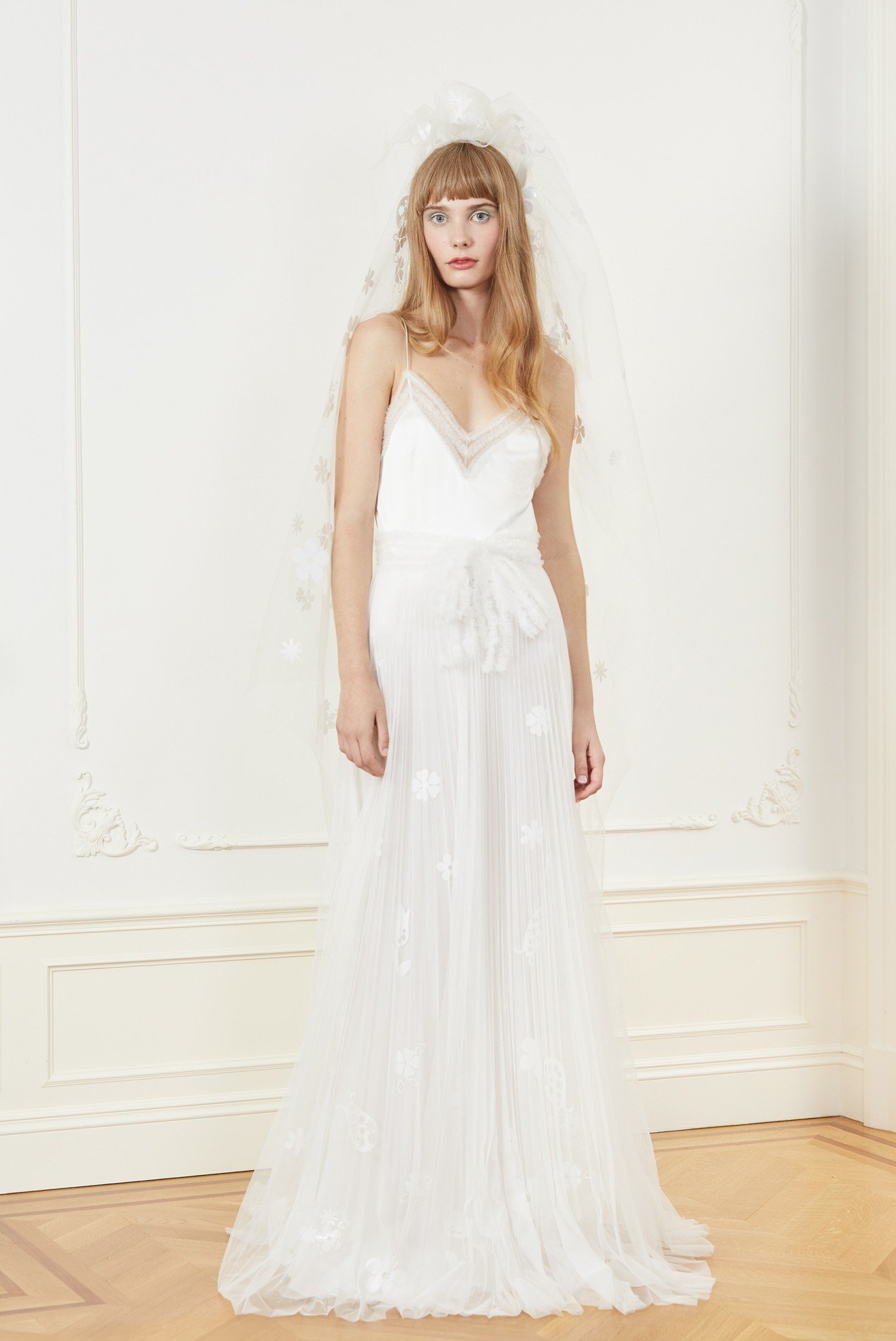 silk charmeuse camisole with white shirred tulle embroidery and pleated tulle skirt with laser cut floral