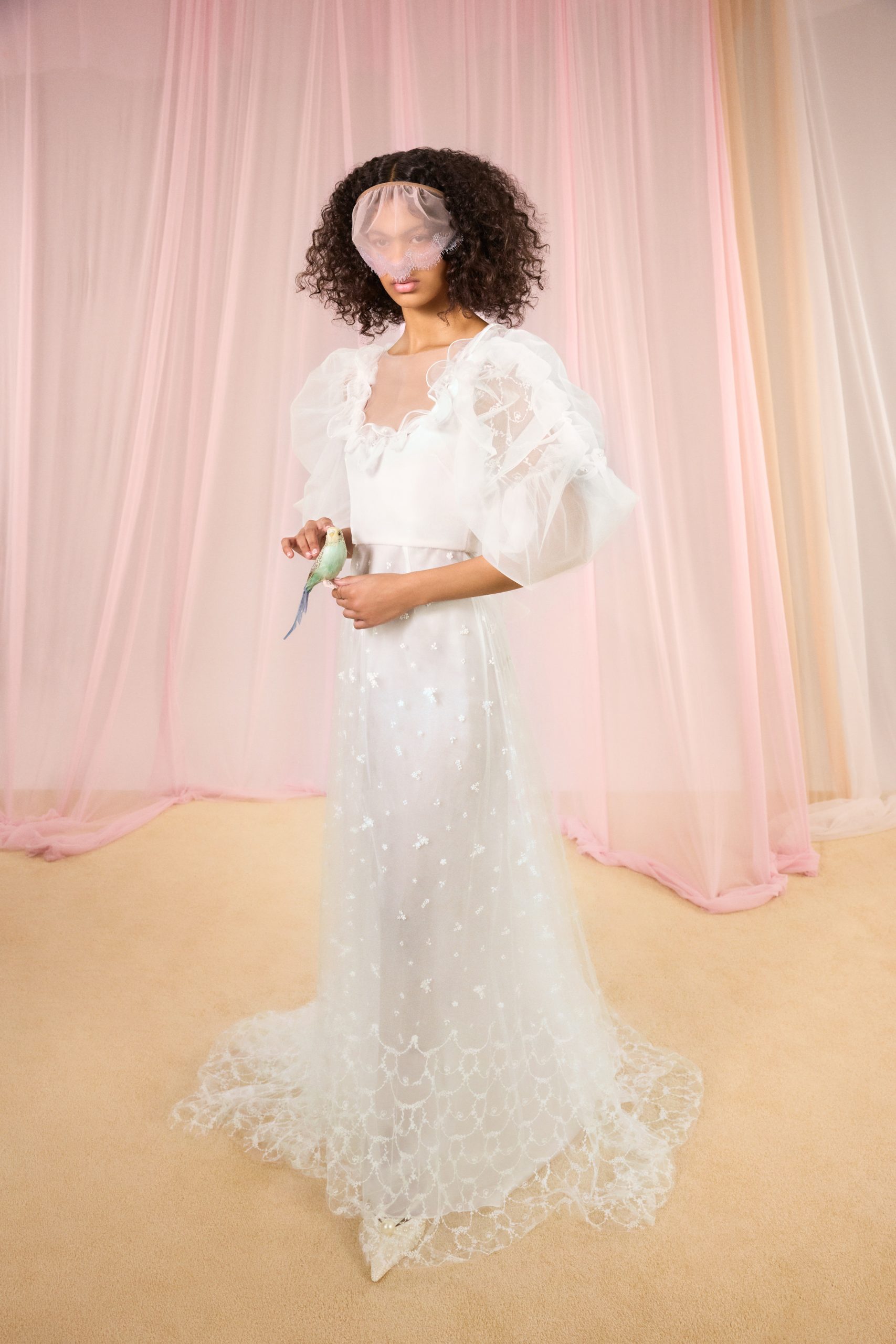 glass velvet column gown with exaggerated puff sleeve and embroidered tulle overlay