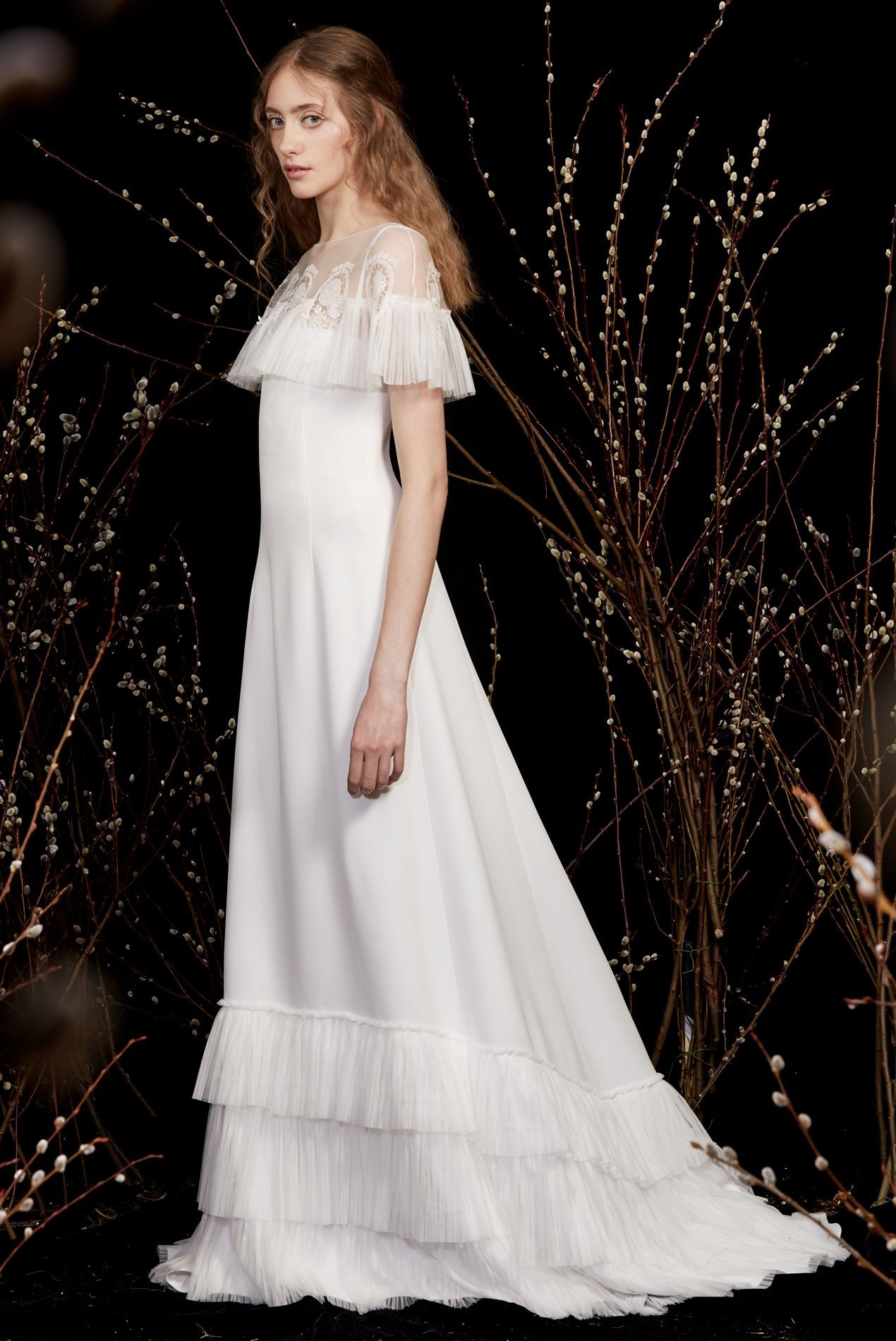 crepe gown with pleated tulle ruffle hem and pleated tulle capelet with medallion embroidery