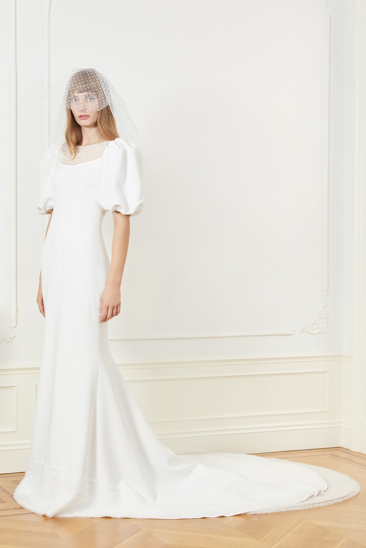 fitted crepe gown with puff sleeves and shirred tulle embroidery